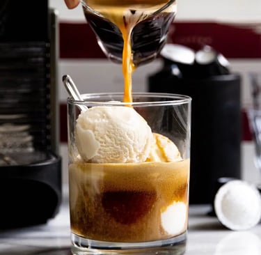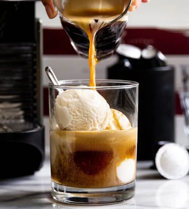Ingrediënten: Bolletjes vanille-ijs, shots espresso